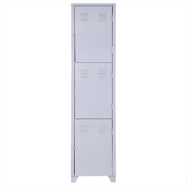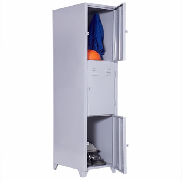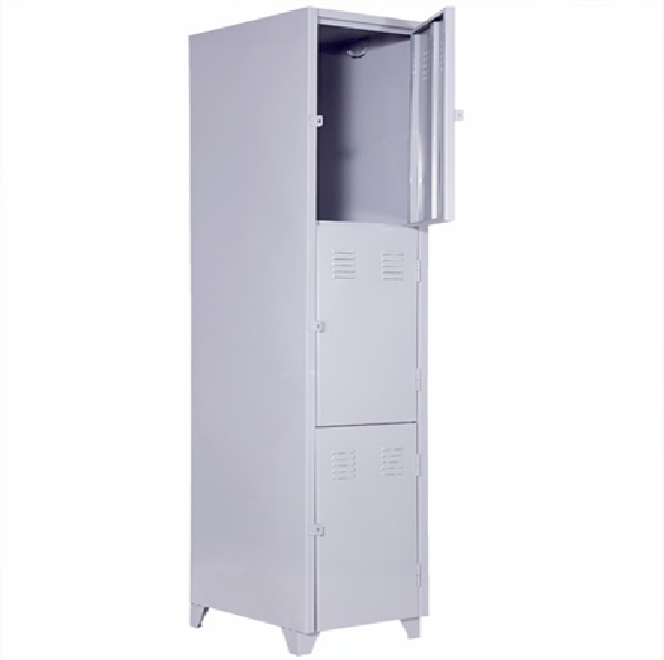 Roupeiro de Aço com 03 portas Médias em “CHAPA 26”com Pitão para Cadeado, ideal para academias, supermercados, empresas e para uso em geral. Possui portas ventiladas e pés elevados.
