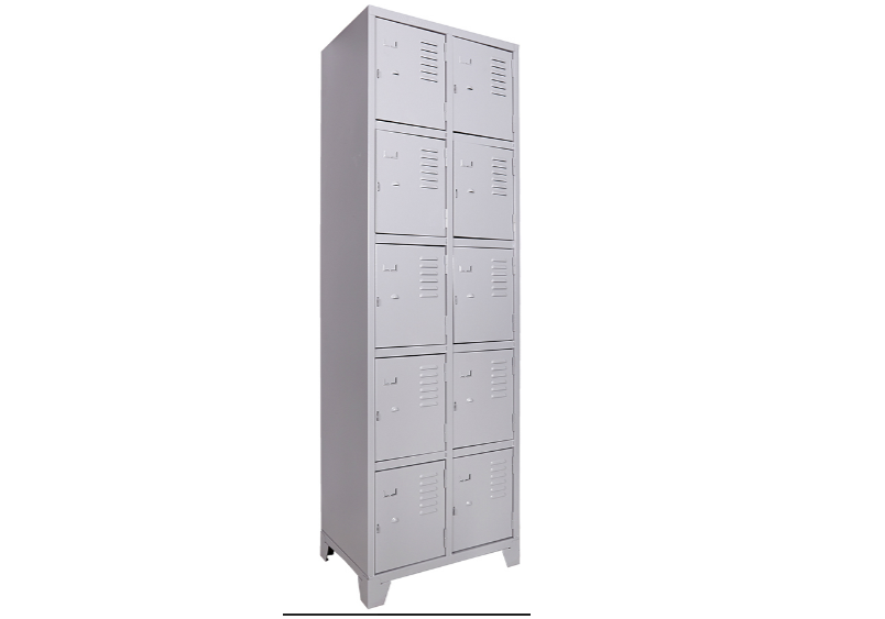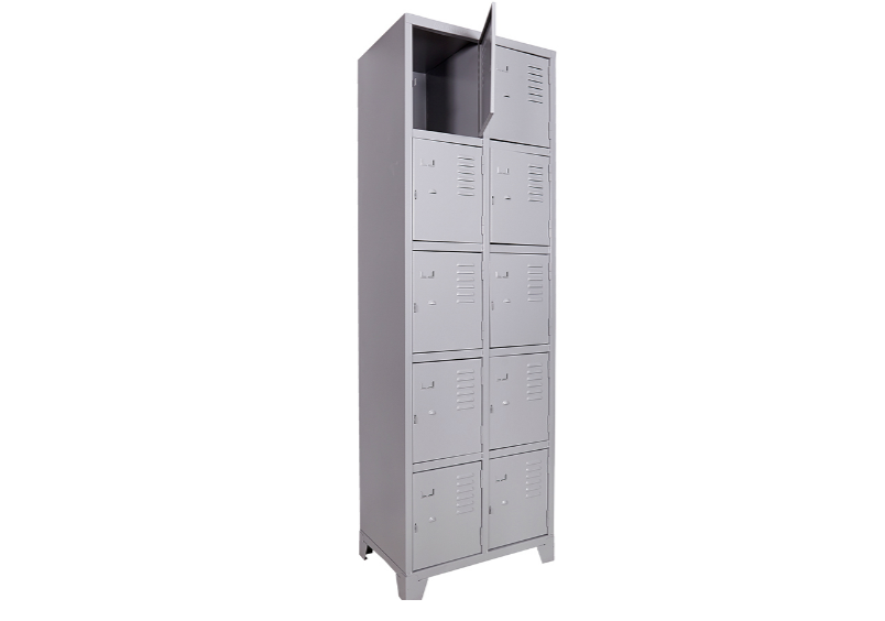 Roupeiro de Aço com 10 Portas Pequenas em “CHAPA 26”com Pitão para Cadeado, ideal para academias, supermercados, empresas e para uso em geral. Possui portas ventiladas e pés elevados.