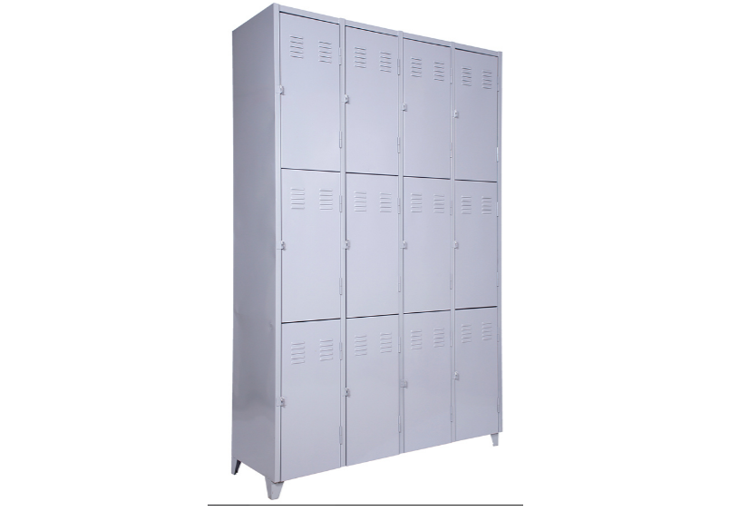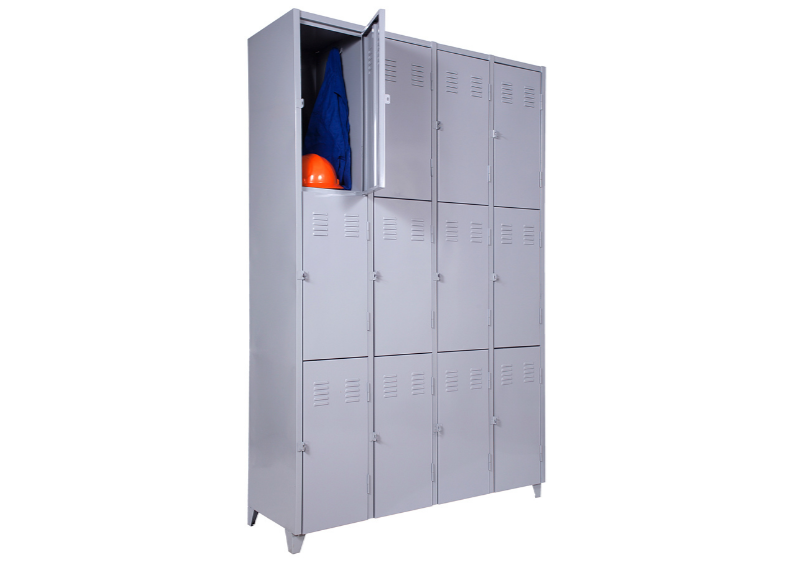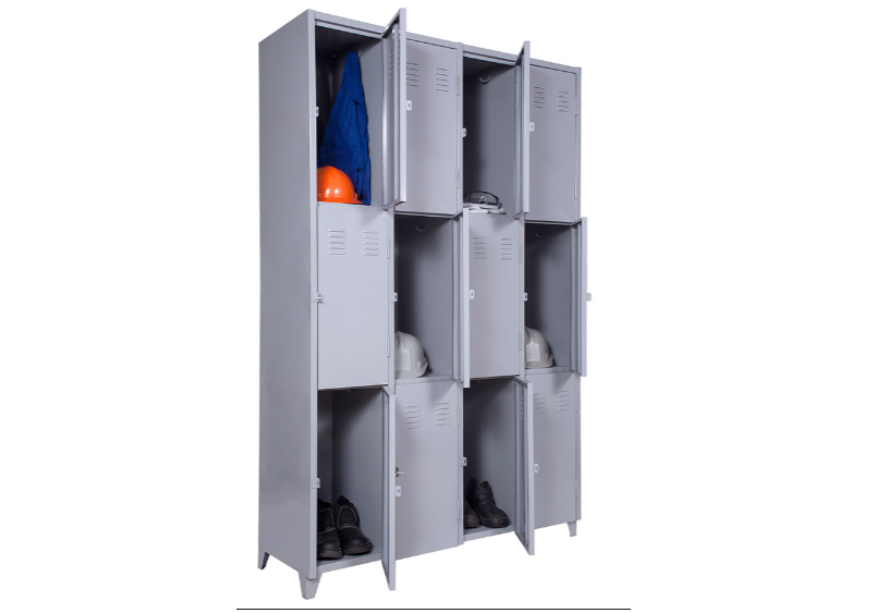 Roupeiro de Aço com 12 Portas Médias em “CHAPA 26”com Pitão para Cadeado, ideal para academias, supermercados, empresas e para uso em geral. Possui portas ventiladas e pés elevados.