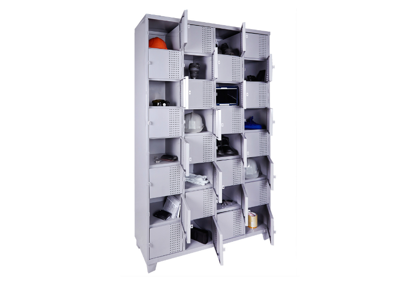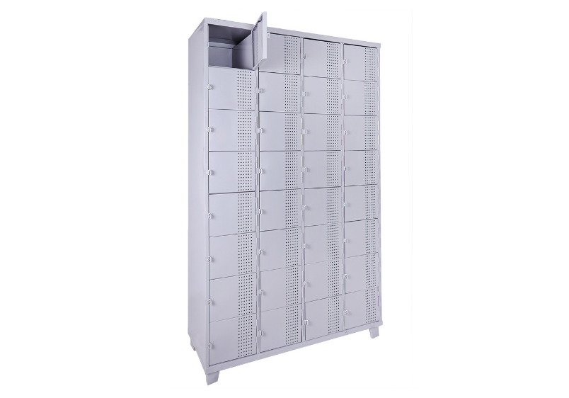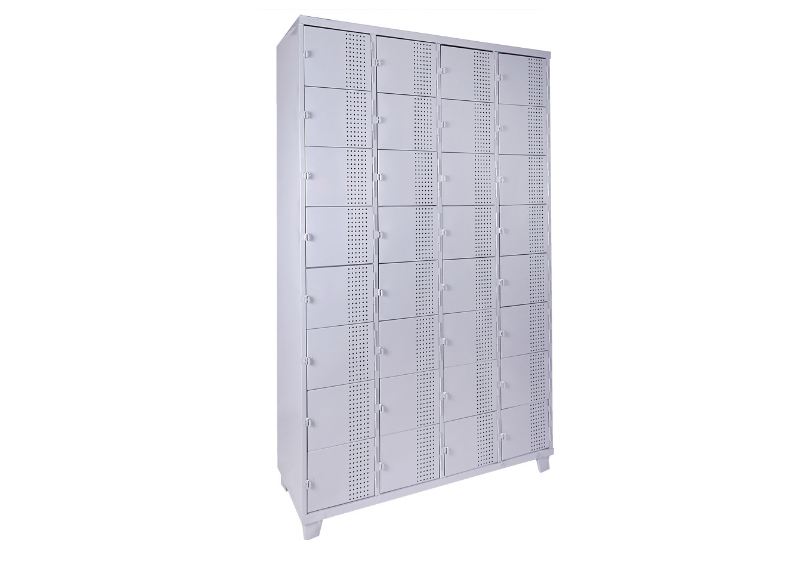 Roupeiro de Aço com 32 portas Pequenas em “CHAPA 26”com Pitão para Cadeado, ideal para supermercados, empresas e para uso em geral. Possui portas ventiladas e pés elevados.